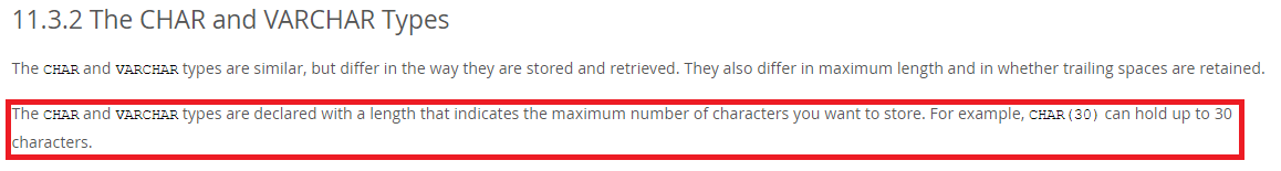 위 이슈에 대해 MySQL Reference를 찾아보니, char 및 varchar 타입은 최대 문자 수를 나타내는 길이로 선언되는데, 예를 들어 varchar(10)은 10byte가 아닌 최대 10자까지 입력할 수 있다는 의미이다.