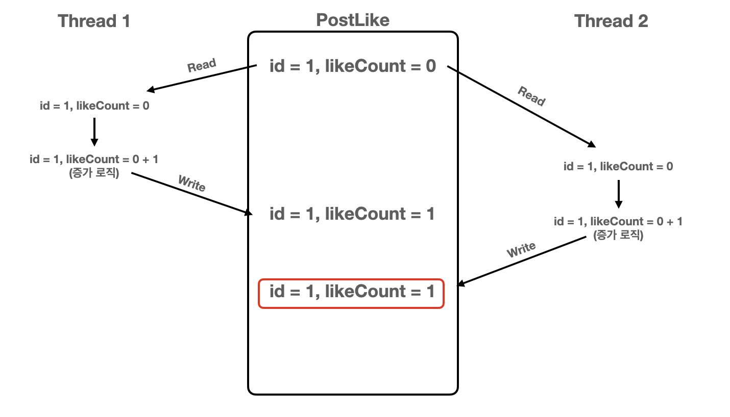 공유 데이터(likeCount)에 스레드들이 동시에 접근해서 수정하기 때문에 순차적으로 좋아요가 증가되지 않는다. 즉, 스레드 1이 증가시킨 좋아요가 저장되기 전에 스레드 2가 좋아요를 조회하고 해당 값을 토대로 증가 로직을 실행하기 때문에 순차적인 증가가 이루어지지 않아 문제가 발생한다.