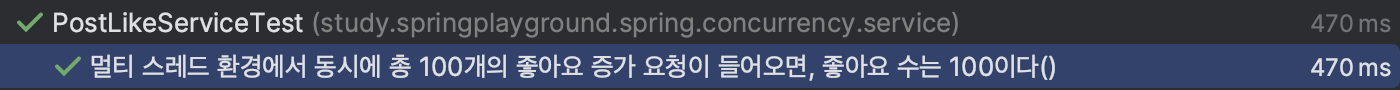 20개의 스레드를 활용할 수 있는 스레드 풀을 생성한 뒤, 해당 스레드들을 활용하여 동시에 총 100번 좋아요를 증가시키는 로직이 수행되도록 테스트 코드를 작성하였다.