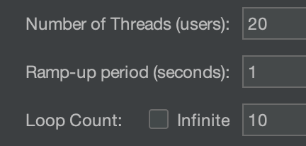 2개의 서버에 동시에 요청을 보내기 위해 Jmeter를 사용한다. Thread Group으로 20개의 스레드가 총 10번 실행되도록 설정해서 각 서버에 요청을 200번 보낼 것이다. (총 400번) 따라서, 실제 테스트를 진행했을 때의 기대 결과 값은 좋아요 수에 400이라는 값이 들어 있어야 한다.